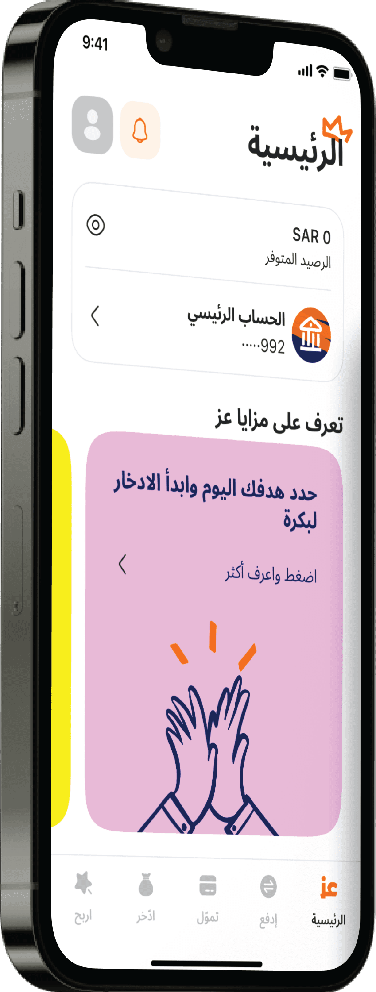 حسِّن مدخراتك وخصص الأموال للأشياء اللي تهمك. صممنا حسابات فرعية لأهداف التوفير مع معززات تساعدك على الادخار بشكل ذكي وسريع.